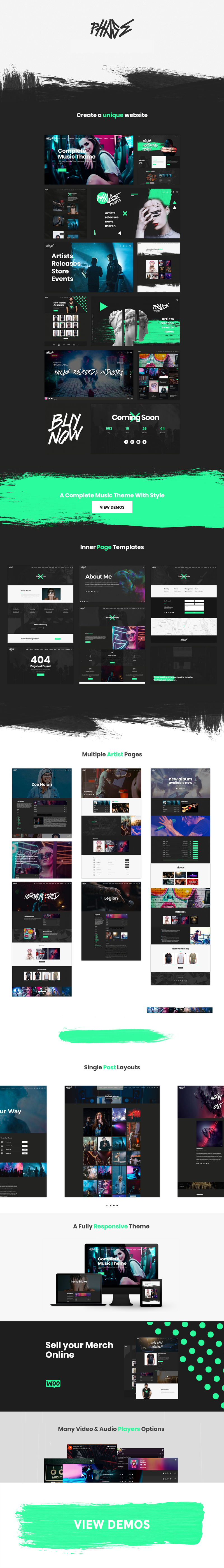 Phase - A Complete Music WordPress Theme for Record Labels and Artists ... Phase is a complete music WordPress theme for record labels, artists, bands and everyone working in the music industry. It includes an artist custom post type, a discography, video, photo, shop and blog features. It is designed with terrific attention to details, flexibility, and performance.